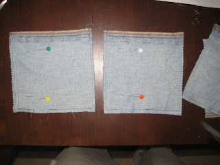 2. Using a 6.5 inch square template or a ruler, mark off 4X adjacent 6.5 inch sections using the seam on one edge as your "straight edge."  Using an already sewed seam reduced your sewing workload!!